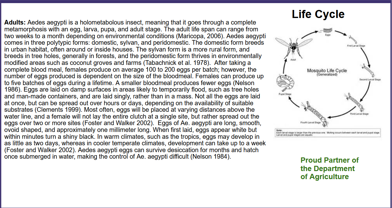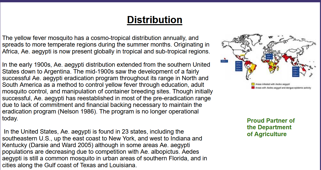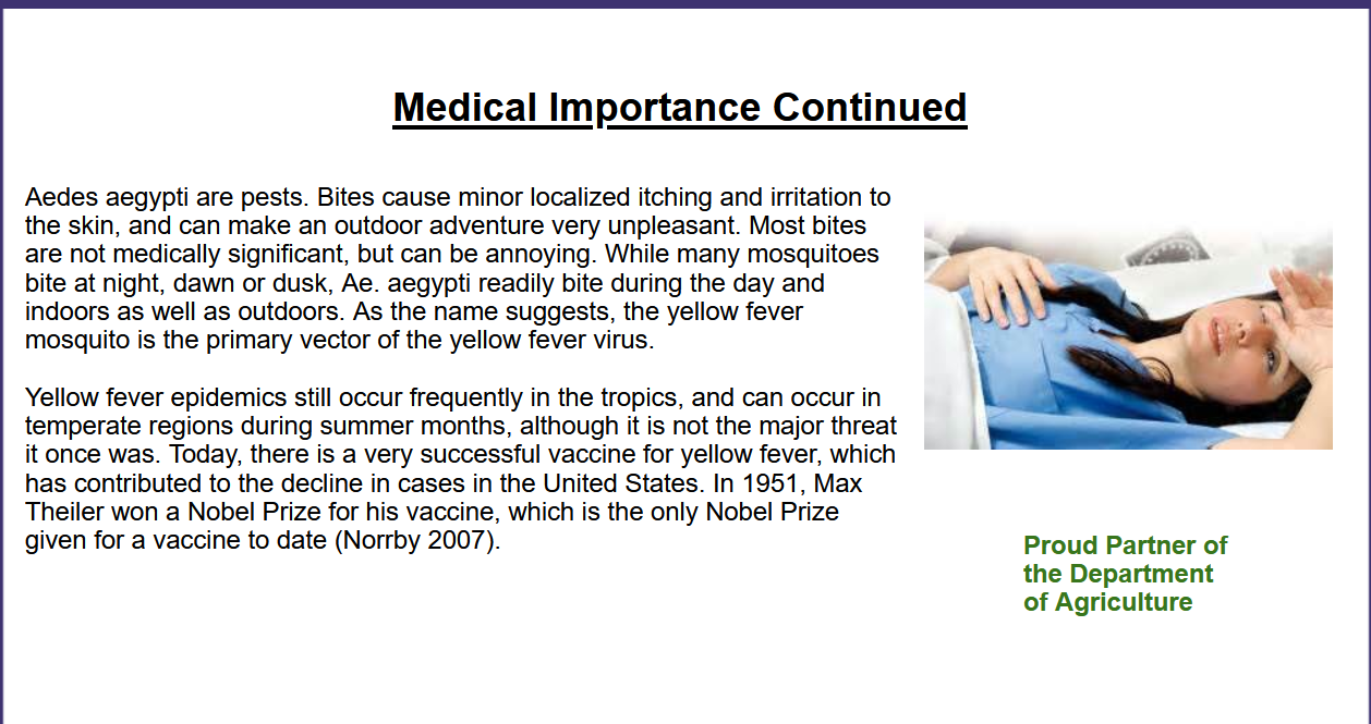 Aedes aegypti, the Yellow Fever mosquito, is one of the mosquitoes that we see on a daily basis here in the Raleigh-Durham area. The other predominant species that we battle here is Aedes albopictus, the Asian Tiger mosquito.