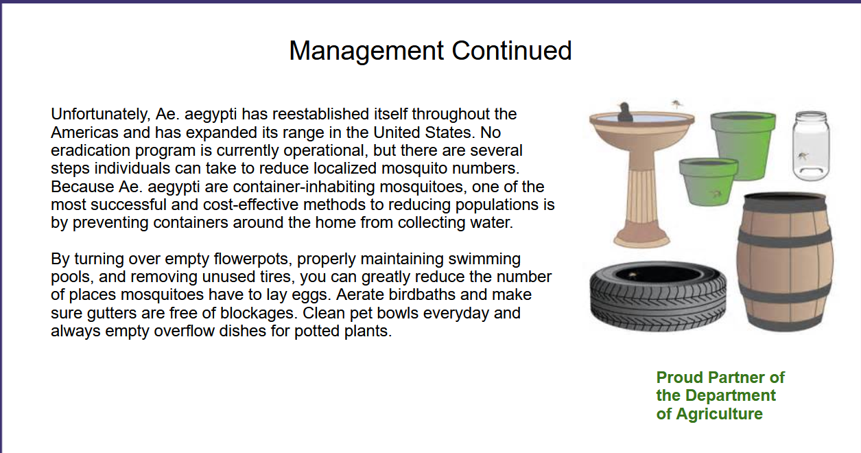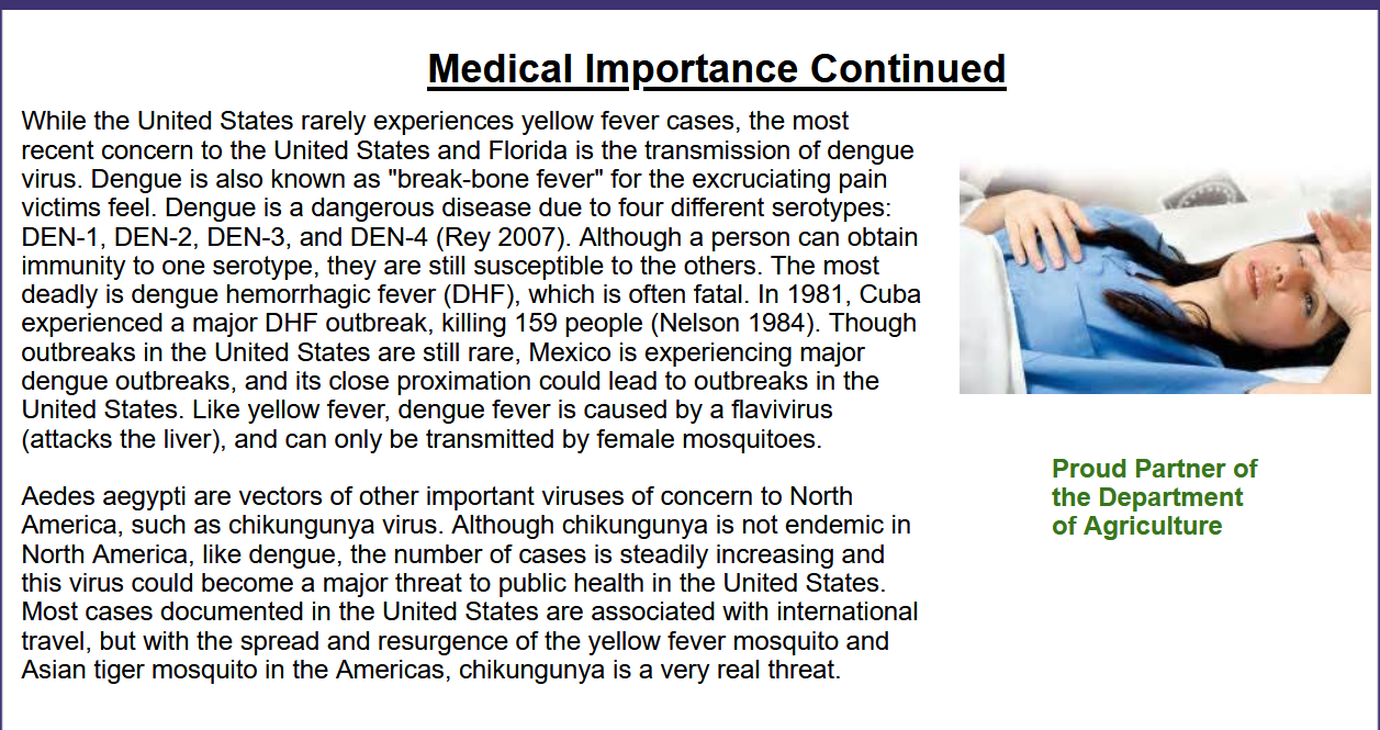 Aedes aegypti and aedes albopictus also transmit chikungunya virus, which is being increasingly seen in the United States, particularly Florida. Information about chikungunya can be found at https://www.medicalnewstoday.com/articles/306828