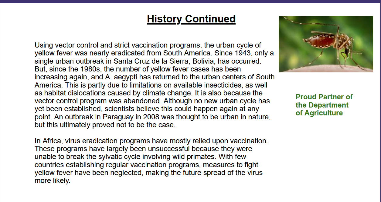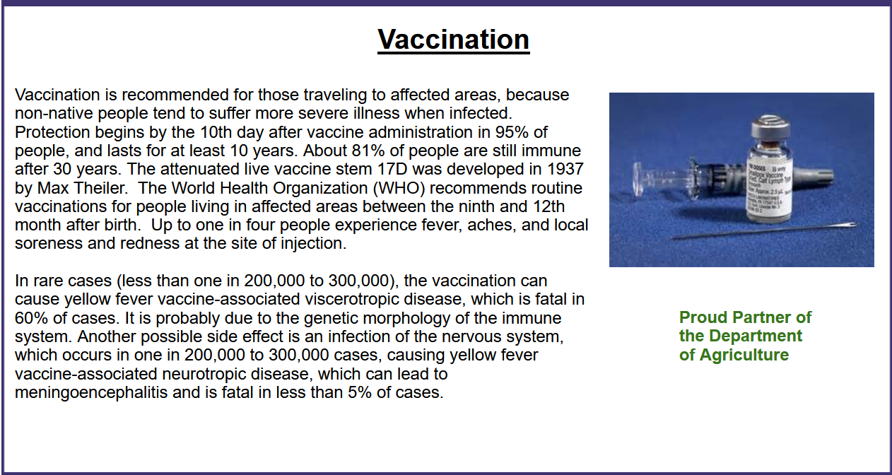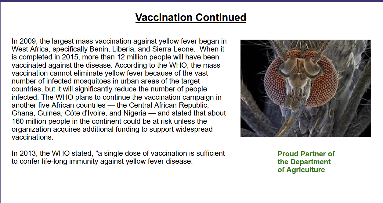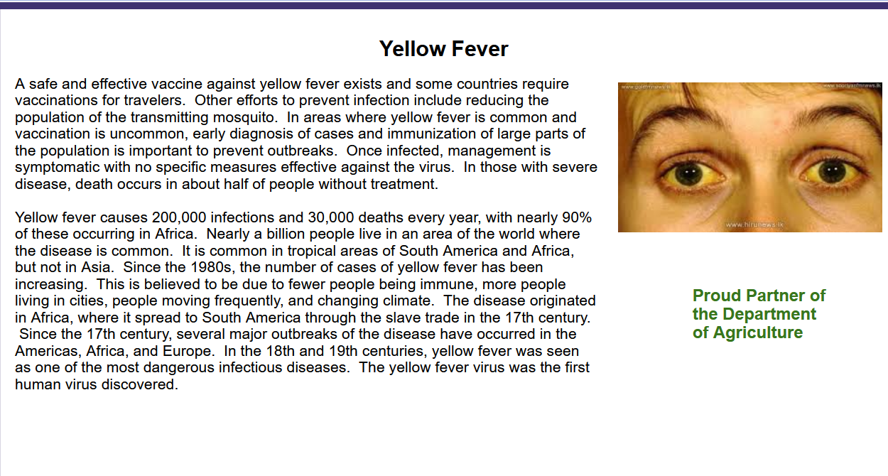 Luckily, there have been no major outbreaks of yellow fever in the U.S. since the early 20th century. Previous to that, tens of thousands of Americans died of yellow fever, which is an extraordinarily painful way to die.