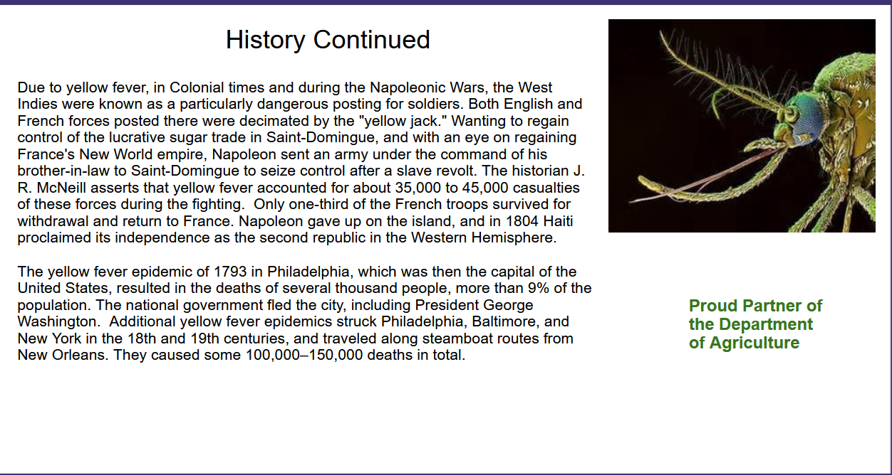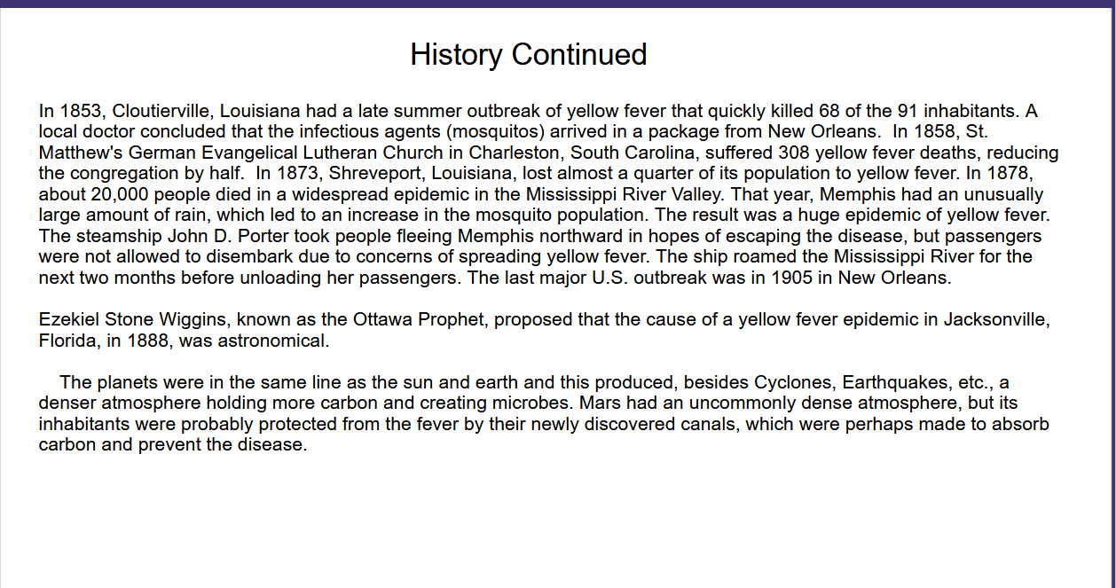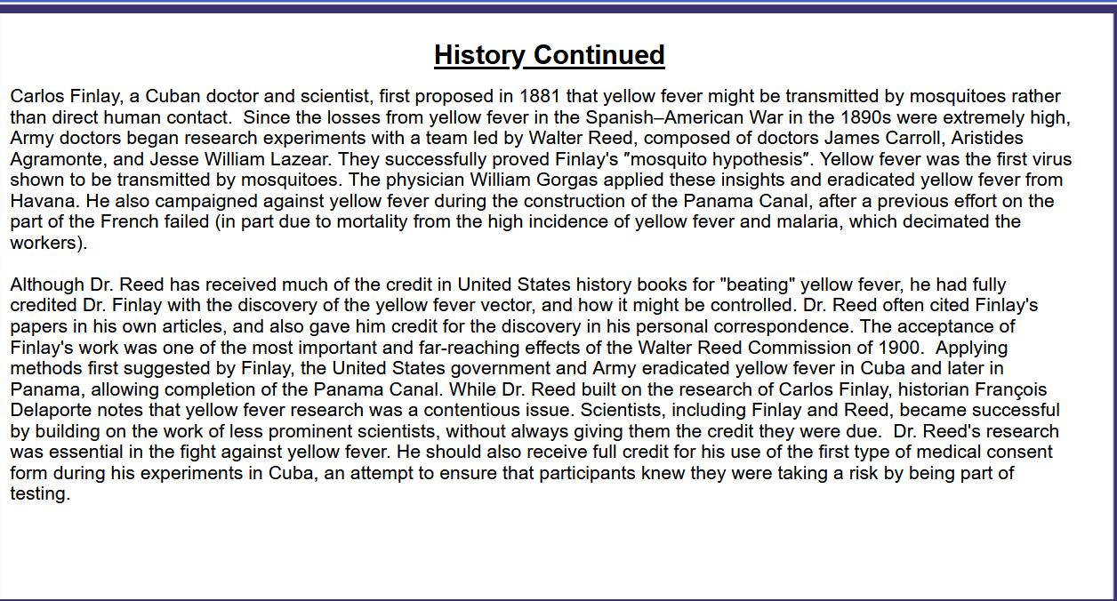 An interesting film by PBS that documents the search for the cause of Yellow Fever can be found at https://www.pbs.org/wgbh/americanexperience/films/fever/ and https://www.youtube.com/watch?v=N-nk6nJMqYo